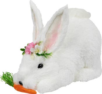 Capturing the whimsy of Easter, this charming rabbit figurine will add a touch of joy to your seasonal decor. This adorable bunny holds a carrot in its mouth, exuding a playful charm. Adorned with a delightful floral crown on its head, this whimsical decoration adds a touch of Easter cheer to your home. Product Features: White rabbit Easter figurine Accented with a floral crown and a carrot in the mouth Ideal for mantels, shelves and tables For indoor use only Dimensions: 7"H X 9.25"W X 5"D Materials: sisal/foam/plastic