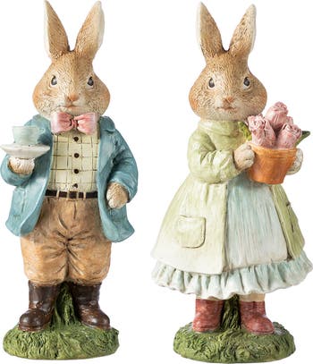 This 9.75"H Easter Resin Bunny Couple Table Decor includes two bunny figurines: one bunny holds a coffee cup and saucer, while the other carries a pot of pink tulips. The bunnies are dressed in charming outfits, making them a delightful addition to Easter table displays.