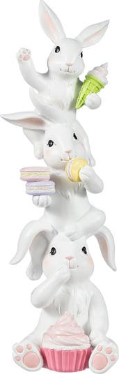This 17.5"H Easter resin decor features three stacked white bunnies. The top bunny holds an ice cream cone, the middle one has macarons, and the bottom one sits with a pink cupcake. It's a whimsical addition to Easter table displays.