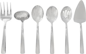 The Oster Eastleigh 6 Piece Stainless Steel Hostess Set with a mirror polish finish combines elegance and functionality for any dining occasion. Made from durable stainless steel with smooth square handles, the set's silver color and polished finish add a sophisticated touch to your table. Designed for both style and comfort, each piece features a modern ergonomic grip, ensuring ease of use.This set includes two serving spoons, one slotted spoon, one pie server, one ladle, and one serving fork, perfect for serving a variety of dishes. While hand washing is recommended to preserve its shine, the Oster Eastleigh Hostess Set offers a durable and stylish solution for all your entertaining needs.
