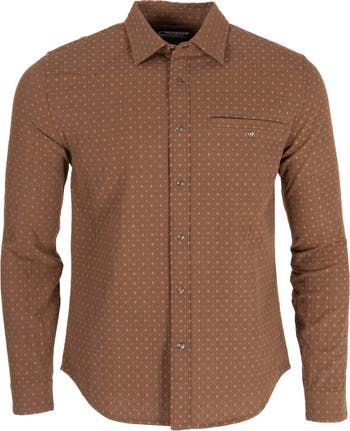 Experience the best of both worlds with the Easton Dobby Shirt. Designed for the modern man who wants to show off his inner-cowboy, this shirt effortlessly transitions from outdoor adventures to work and everything in between. Embrace rugged elegance and make a statement wherever you go.5.5oz 100% CottonWestern inspired style detailsDobby texture in a unique patternWelt pocket with snap closure on wearer's left chestDyed to match pearl snapsAdjustable cuff with snap closureBison snap on bottom placketMK Icon embroidery on back yokeMen's Size Chart