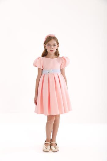 The Easton dress is a beautifully designed piece that exudes elegance and charm, perfect for any special occasion. This dress features a sophisticated puff shoulder bodice, adding a touch of vintage-inspired flair. The tulle belt with a floral embellishment provides a striking contrast and enhances the dress's refined look. Additionally, the tied bow in the back adds a delightful and stylish accent, leading to a pleated skirt that flows gracefully with every movement.