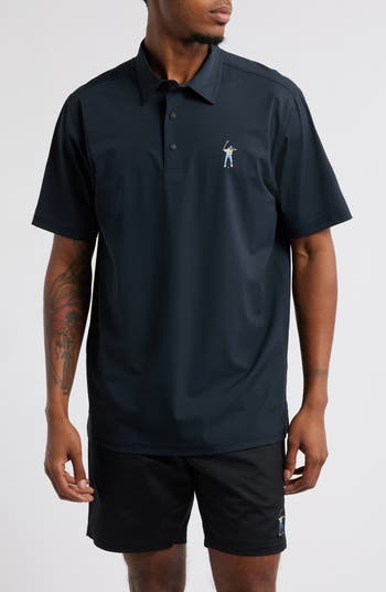 Stretchy, sweat-wicking fabric keeps you swinging comfortably to the 18th hole in a polo that blocks UV rays and features textured snaps inspired by dimpled golf balls.