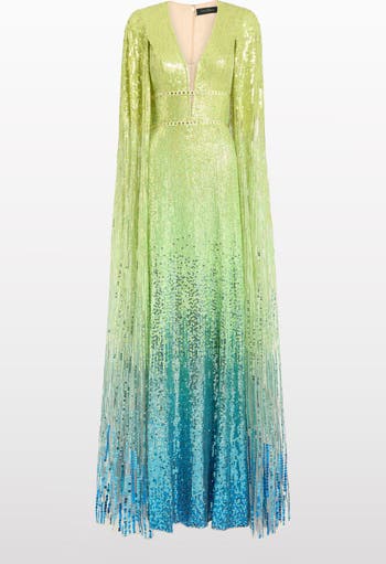 This gown exudes modern drama with its sculpted silhouette, plunging neckline, and floor-length cape sleeves. The ombr sequin finish adds depth and movement, creating a shimmering, fluid effect. A statement piece designed to captivate, blending elegance with high-impact glamour.