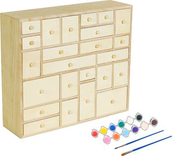 EASY PLAYHOUSE: DIY CRAFT STORAGE & ADVENT CALENDAR - Elevate your celebrations and everyday organization with this versatile DIY wooden advent calendar and storage box, thoughtfully designed to inspire creativity year-round. Featuring 24 smooth-sliding drawers with decorative wooden knobs, this sturdy, unfinished wood piece becomes a blank canvas for your artistic vision. Complete with 12 vivid paint colors and 2 artist brushes, the kit empowers you to personalize every detail—whether you’re counting down to Christmas, marking birthdays, anniversaries, or celebrating any special milestone. MULTI-FUNCTIONAL CABINET: Beyond holiday traditions, use it as a jewelry organizer, craft supply chest, or a unique way to store little treasures and keepsakes. Sized at 14.56 inches long, 12.6 inches high, and 4 inches deep, it seamlessly fits on tabletops or mounts to your wall, bringing functional charm to any room. Create a customized countdown calendar for graduations, vacations, or motivational goals, or craft a family heirloom that sparks memories and creativity with each use. Designed for both solo crafting and family projects, the durable wood ensures your creation stands the test of time. Make tradition, organization, and artistic expression part of life’s milestones with this unique storage solution. Glue included; attach knobs after painting for best results.