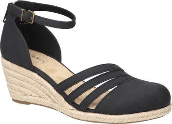 An asymmetric topline creates stylish dimension on an espadrille-inspired wedge secured with an adjustable ankle strap and zipper at the heel counter. A cushioned footbed and flexible, treaded sole ensure all-day comfort.