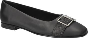 Geometric hardware highlights the mixed-texture upper of a streamlined faux-leather flat featuring a slim square toe and grounded by a foam-cushioned footbed.
