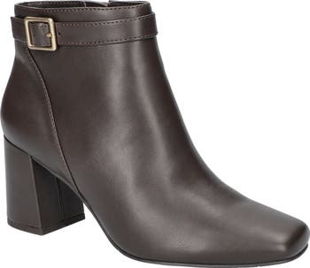 A buckle detail adds a flash of contemporary sophistication to a streamlined block-heel bootie complete with the comfort of a lightly cushioned footbed.