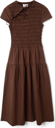 A sweetly smocked organic cotton dress adds a little shot of sass with a delicately tied cutout detail on the chest.