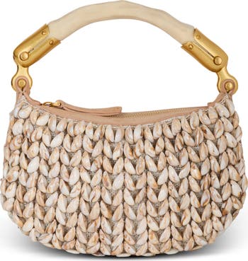Ebene Mini bag in suede and shells For carrying in the hand Curved handle in horn-effect resin Gold metal zip fastening with Balmain Stamp logo Gold metallic hardware Smooth leather lining Embossed leather inside card pocket Dimensions: 7 x 26 x 13��cm Main material: 100% jute Made in Italy Item: GN0BS027ASES