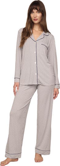 Slip off to dreamland in the vintage-inspired styling of pajamas crafted from lusciously soft patterned jersey trimmed with contrasting satin piping.