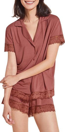 Lightweight PJs in a supersoft jersey knit with floral-lace trim are ones you'll want to wear all weekend long.