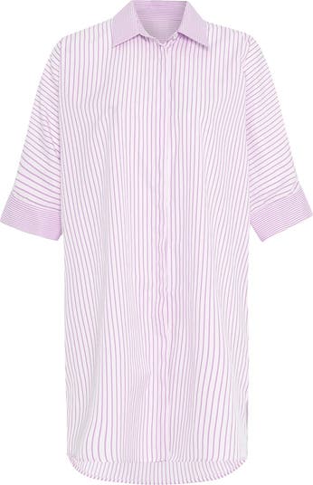 A timeless convertible dress with a modern twist. Featuring a button-back detail that can be unfastened for adjustable styling, this dolman-sleeve dress blends ease with structure. Finished with raglan ¾ sleeves, side slits, and mixed-stripe collar and cuff details, it’s an elevated menswear-inspired piece with a feminine edge.