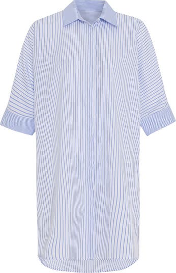 A timeless convertible dress with a modern twist. Featuring a button-back detail that can be unfastened for adjustable styling, this dolman-sleeve dress blends ease with structure. Finished with raglan ¾ sleeves, side slits, and mixed-stripe collar and cuff details, it’s an elevated menswear-inspired piece with a feminine edge.