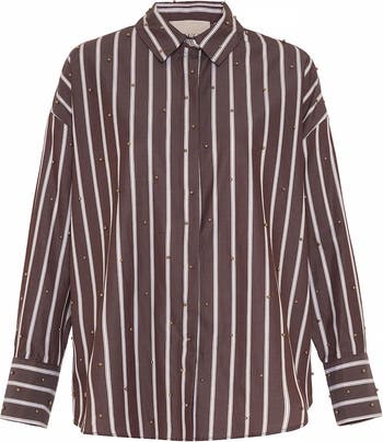 A classic white button-down shirt with a twist‚ this poplin blouse is finished with delicate pearl embellishments along vertical stripes. Ideal for dressing up jeans or wearing under blazers, it's a timeless wardrobe staple with subtle shine.