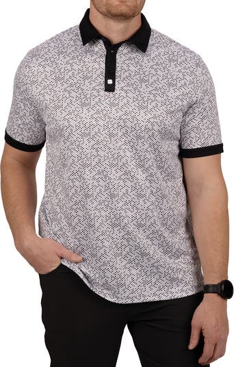 The Echo polo combines modern style with peak performance. Made from 100% poly stretch Syntrel, this white polo features a sleek black collar and placket with a unique black dot pattern. Breathable, moisture-wicking, low shrinkage, and 4-way stretch ensure comfort and mobility on or off the course.