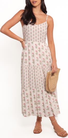 A garden of roses romance this lightweight cotton-kissed midi made with a shaping smocked back and flouncy tiered ruffles.