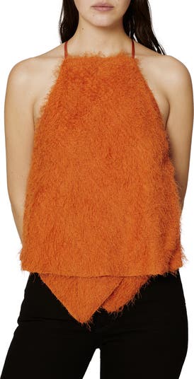 Delicate threads wave over the surface of this wispy top featuring a breezy open back and flowy hankerchief hem.