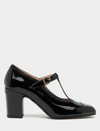 The Eclayr pump brings a modern twist to a timeless block-heel style. In black patent leather, broguing embellishes the collar and toe cap. Gold-tone metal hardware, from the branded buckle on the t-strap to the Crest accent on the heel counter, embellishes this timeless pump.