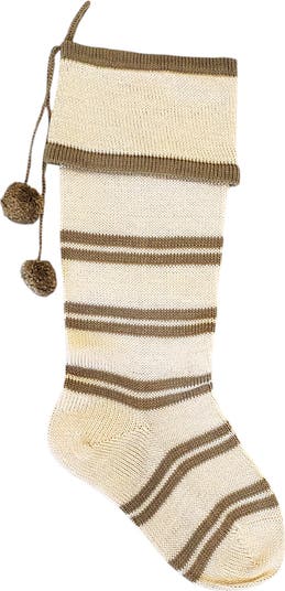 Featuring a classic ivory base adorned with subtle, earthy brown stripes, this stocking exudes a warm, rustic charm perfect for creating a cozy holiday atmosphere. The fold-over cuff, finished with matching brown trim, adds a refined touch, while the playful pom-poms on the side bring a hint of whimsy to the design. Perfect for hanging by the fireplace, this stocking is as functional as it is decorative, offering plenty of room for treats, small gifts, and holiday surprises. The durable cotton weave ensures that this stocking will become a cherished part of your holiday traditions for years to come.