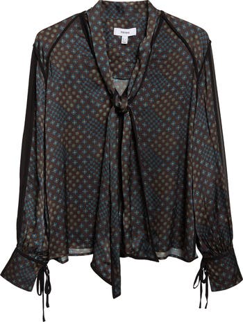 Look polished on your journey to the C-Suite while remaining your fashion-forward self in this foulard-print shirt finished with ties and the V-neck and cuffs.