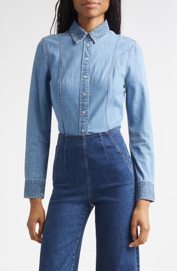 Rhinestone trim and structured paneling refine this denim shirt tailored with a crisp point collar and clean seaming for a modern look.