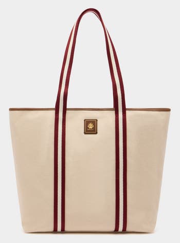 This Edelbliss tote bag showcases the Bally Ribbon on both sides, extending into the two top handles and framing the leather Bally Crest patch which trims one side of this unbleached canvas bag.