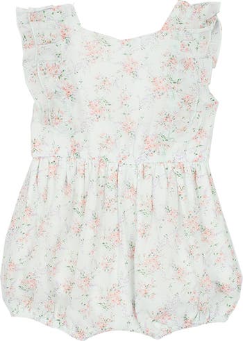 This baby girl romper features a botanical print in soft pastel with shades of pink and blue. The romper is designed with sweet ruffled details in a bubble silhouette. Fabric Care & Content Machine Wash Cold | Line Dry | Do Not Bleach 100% Polyester