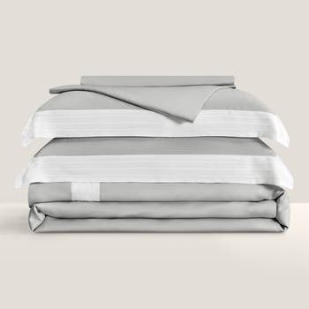 - A wide decorative border with a complex finishing stitch adorns the upper part of the duvet cover