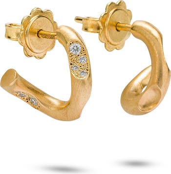 Huggie model with an unexpected twist, embellished with asymmetrical dimples with luminous micro pav of sapphires or diamonds. The captivating structure, characterized by a sculptural interplay of solids and voids, combines elegance with a touch of irony, making them the perfect accessory for those who love to stand out with style. 100% Handmade in Italy. Conflict-free diamonds, compliant with the Kimberley Process.