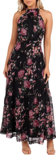 A dreamy floral print adds whimsical charm to an airy maxi dress featuring a gathered halter neck balanced by an ankle-grazing skirt.