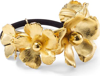 Wearing flowers in your hair is as easy as finishing your ponytail with this curvaceous cuff detailed with a trio of goldtone blooms.