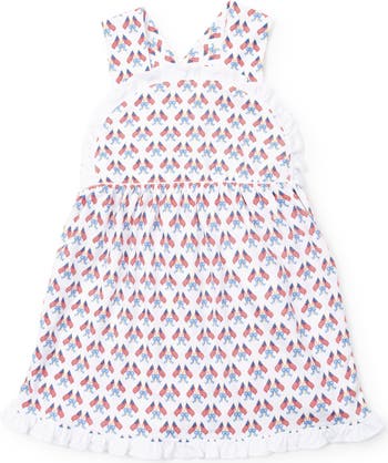 Girls' cross back sleeveless pima dress with ruffles. Snaps secure the straps in back. Gathered waist in the back. Coordinates with the Eloise Bubble. Made from 100% Peruvian Pima Cotton.