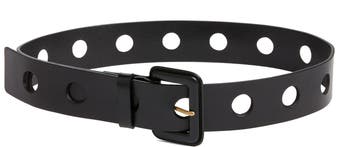 Oversized holes define this sleek leather belt that adds an ultramodern touch to any look.