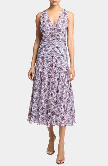 - Sleeveless Midi Dress with Center Ruching in Geometric Printed Georgette