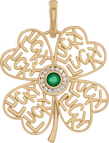 Radiate luck with this cutout clover pendant made from 14-karat gold and illuminated by a halo of diamonds and a faceted emerald at the center.