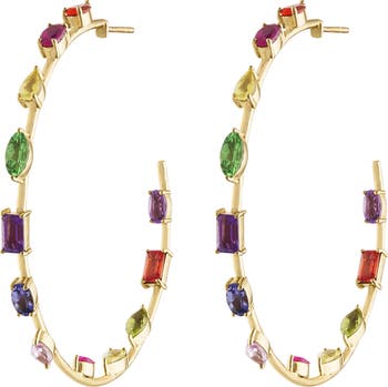 Mixed-shape sapphires run the rainbow spectrum along and within these 14-karat-gold hoop earrings.