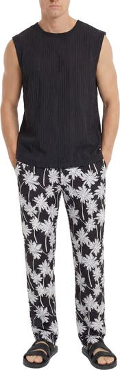 Make a statement in this men's sleeveless shirt: a bold black base contrasted by a crisp white palm print for a modern, tropical edge. Pair with swim trunks or printed shorts for a coordinated beach look, or with chinos and sneakers for warm-weather street style.