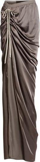 This softly draped satin skirt constructed with a soft elastic waist is ruched with an adjustable drawstring at one side and cut with a slight train that trails gently as you walk.
