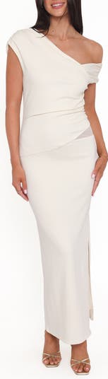 Rippled waistline ruching enhances the texture and shape of this figure-skimming maxi accented with sheer mesh and meant to show off your shoulder.
