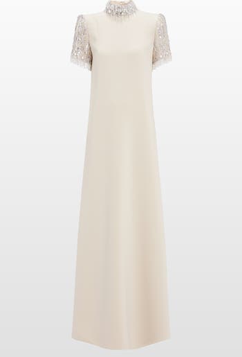 Understated yet undeniably glamorous, this gown is cut in a sleek, statuesque silhouette with softly flared proportions. Its high neckline and short sleeves are framed with tonal sequin and bead embellishment, adding a refined contrast of texture and light. Ideal for a formal dinner or a sophisticated evening event, it offers quiet drama with contemporary polish.