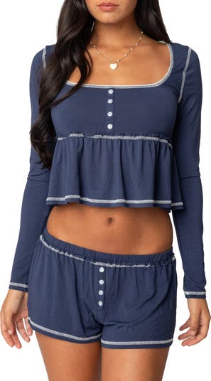 Contrasting topstitching adds to the laid-back vibes of this stretchy babydoll top cut to a cute cropped length.