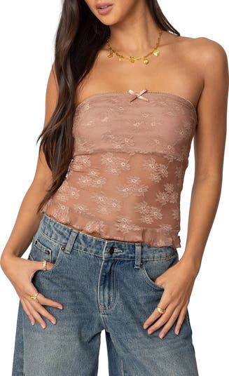 Lovely sheer floral lace glides over the solid bandeau underlayer of this flirty tube top cut in an on-trend cropped silhouette.