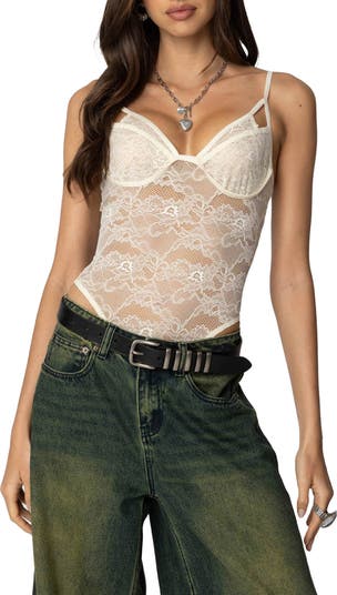 Date night is calling in this lacy bodysuit designed with flirty cutouts at the cups and a sheer design below the bust.