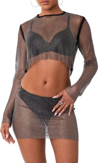 Get ready to party in this sheer, netted top that features a highly cropped hem and sparkling rhinestone embellishments.