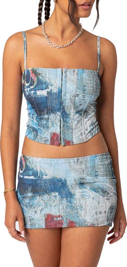 Corset-inspired shaping gives an alluring look to an abbreviated mesh top printed in a collage of romantic images.