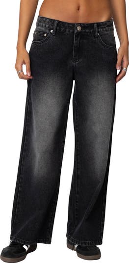 Faded through the thighs for a lived-in look, these nonstretch jeans have a low-rise waist and baggy, full-length legs that create a laid-back silhouette.