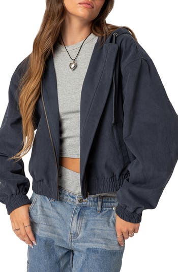 Dropped shoulders and an oversized fit reinforce the relaxed vibe of an all-cotton jacket fashioned with handy pockets and a drawstring hood.