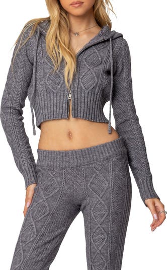 The classic cable-knit cardigan gets a modern makeover in this midriff-baring cropped jacket topped with a cozy drawstring hood and shut with a dual-way zipper.