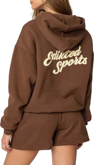 Puffy logo lettering on the front and back adds retro charm to this relaxed hoodie crafted from a soft cotton-rich blend and framed by dropped shoulders.